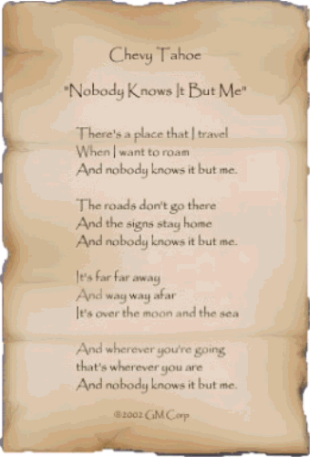 Although nobody knows it but me. Guess where you have heard this before!! Hint- It wasn't off-roading in a Jeep, and if you mouse-over the poem you will get the answer. |